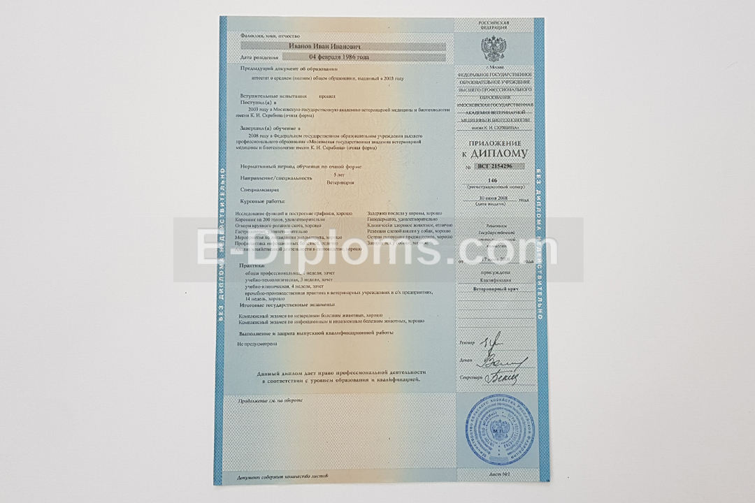 Дипломы на таких же бланках, которые получали выпускники ВУЗов России с 2004 по 2009 года включительно. Учебная программа и все данные по образовательной организации соответствуют периоду; ставим гербовую «мокрую» печать и подписи, как в оригинале.
